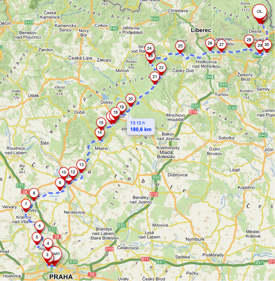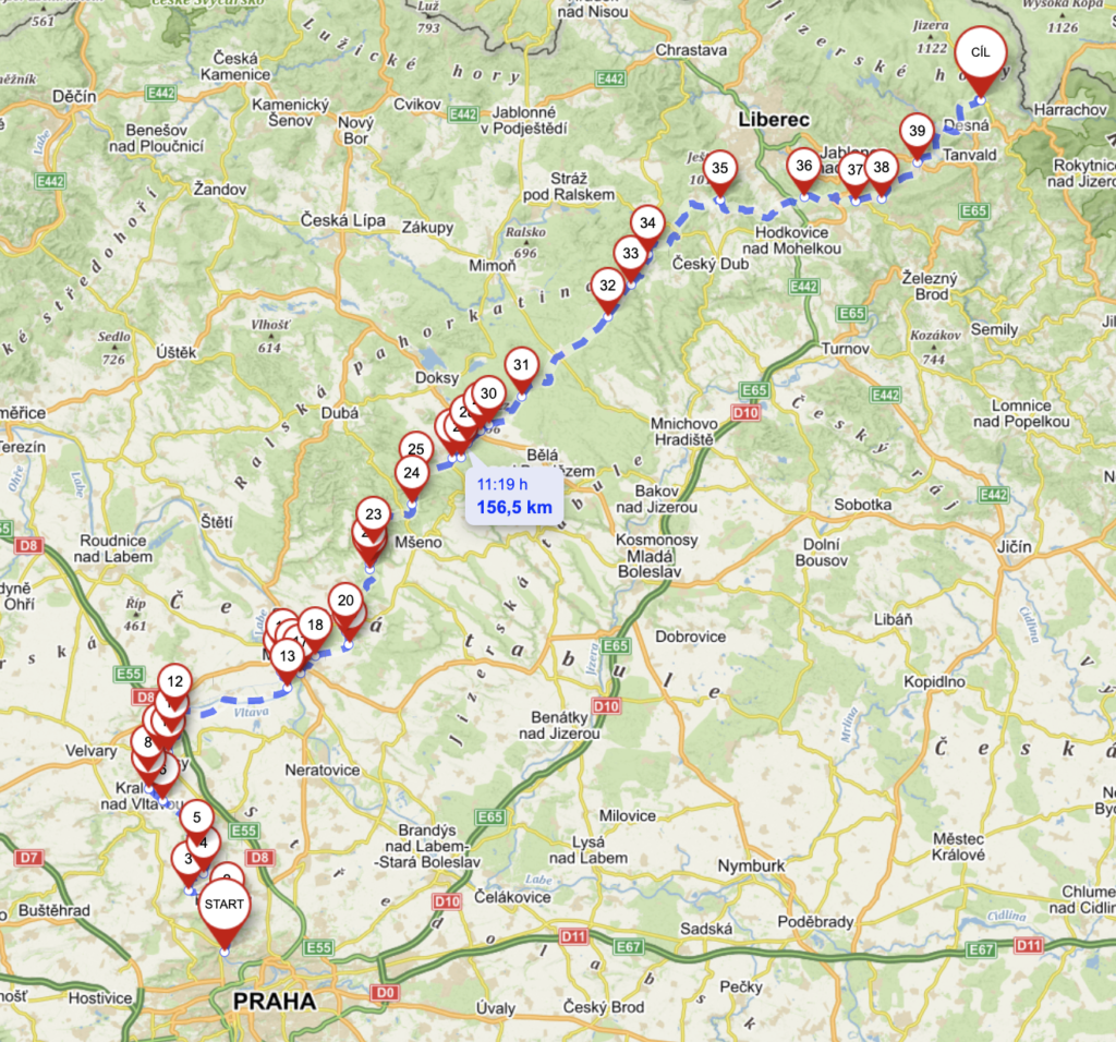 | 1 | Bohnice, Ústavní | Kralupy nad Vltavou za mostem | 20.1 | 69 | 163 | Celý tám na startu, cíl s mostem |